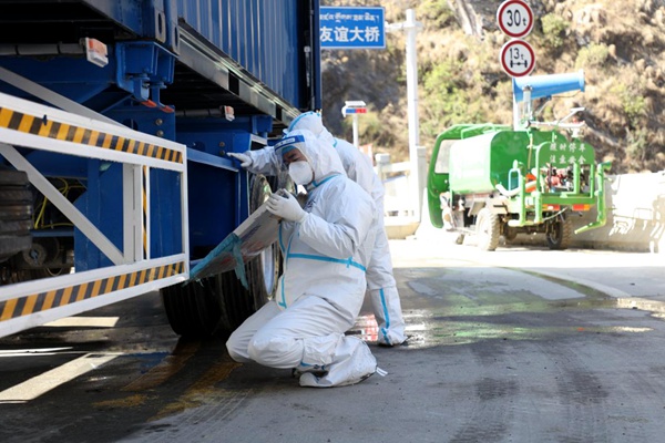 聶拉木邊檢站移民警察為貨車司機送新年禮物。李東洪攝