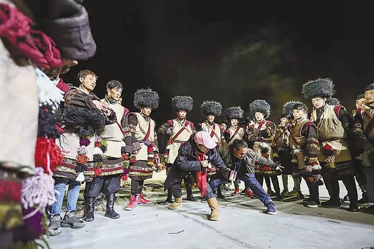 燈光放亮,音樂響起,史詩劇隨著夜色拉開了帷幕,雨中的百人鍋莊在敞亮的舞臺激蕩起千層水光,篝火升騰,染紅了半壁寶瓶山,齊整的“打阿嘎”的遁地之聲伴著夜雨更加氣勢如虹,泥水淹過了腳踝,沿著舞蹈動作的弧度在演員們的腳尖、衣袖間甩落出一條條數(shù)米長的水痕線,面對匍匐、跪拜、奔跑、磕長頭,甚至撲地打滾等舞蹈動作,他們沒有一絲遲疑,衣帽已與泥水混為一體,雨夜中,同進退,共歌舞。