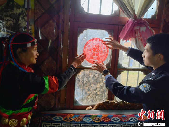 圖為林芝達木邊境派出所民警為轄區(qū)民眾貼窗花。 王濤 攝