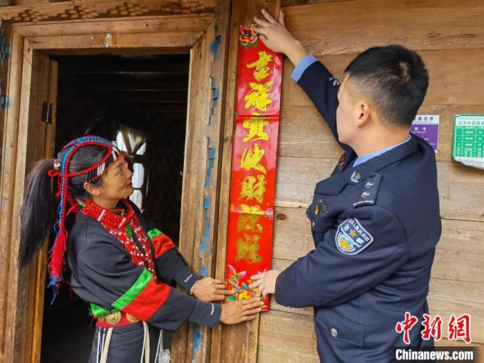 圖為林芝達木邊境派出所民警幫轄區(qū)民眾貼春聯(lián)。 王濤 攝