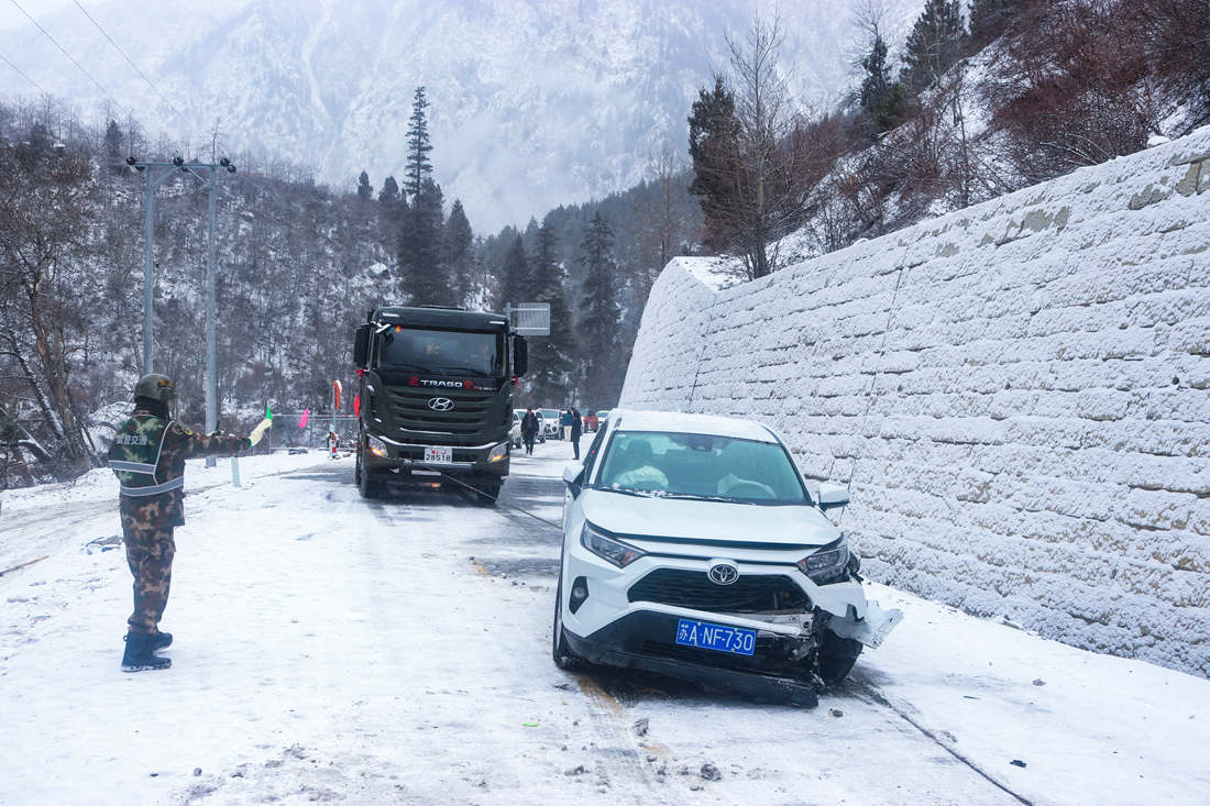 截止2月6日12時30分,經過武警官兵連續4天的艱苦戰斗,因降雪受阻的川藏線和新藏線已恢復道路通行,受阻滯留的車輛人員,在武警官兵的指揮下全部安全順利通過。目前,武警官兵還在持續對部分背陰結冰嚴重路段進行破冰處理。