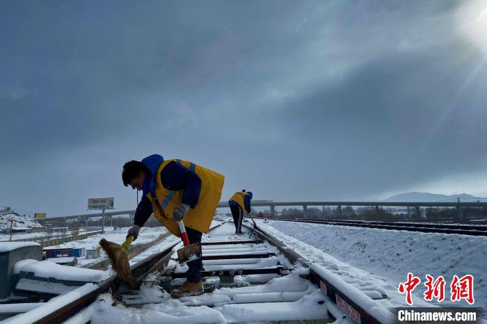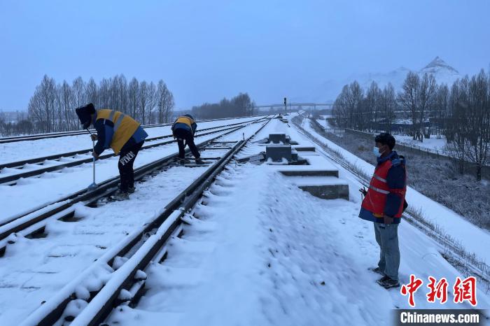 21日,西藏日喀則大雪,鐵路職工清掃道岔關(guān)鍵位置積雪。王來龍 攝