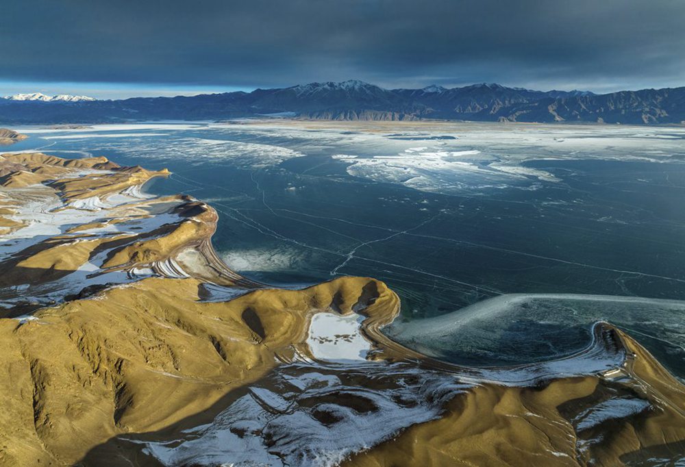 阿里日土縣境內航拍拍攝冬季班公湖。