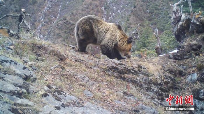 資料圖為2021年10月29日在西藏自治區丁青縣境內由紅外相機拍攝到的棕熊活動影像。 中新社發 山水自然保護中心 供圖