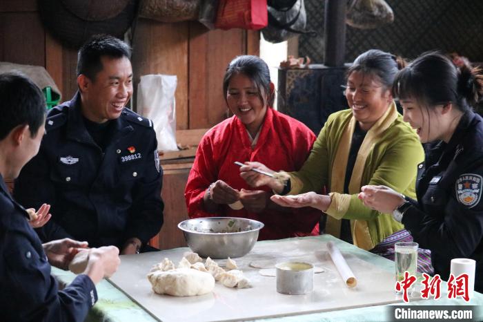 圖為背崩邊境派出所的民警和轄區民眾一起包餃子。呂恒剛 攝