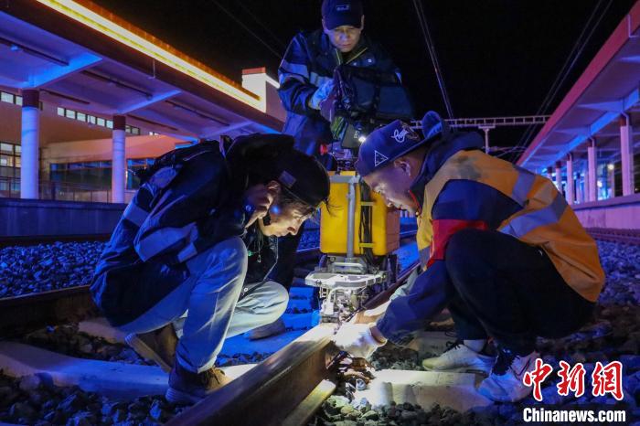 圖為探傷工人夜間使用超聲波探傷儀器檢查鋼軌狀態。 拉巴次仁 攝