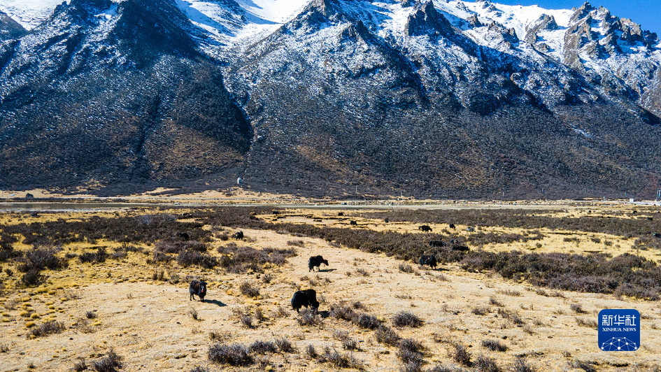 西藏娘亞牦牛養殖產業發展有限責任公司的牦牛在牧場上活動(3月30日攝,無人機照片)。新華社記者 周荻瀟 攝