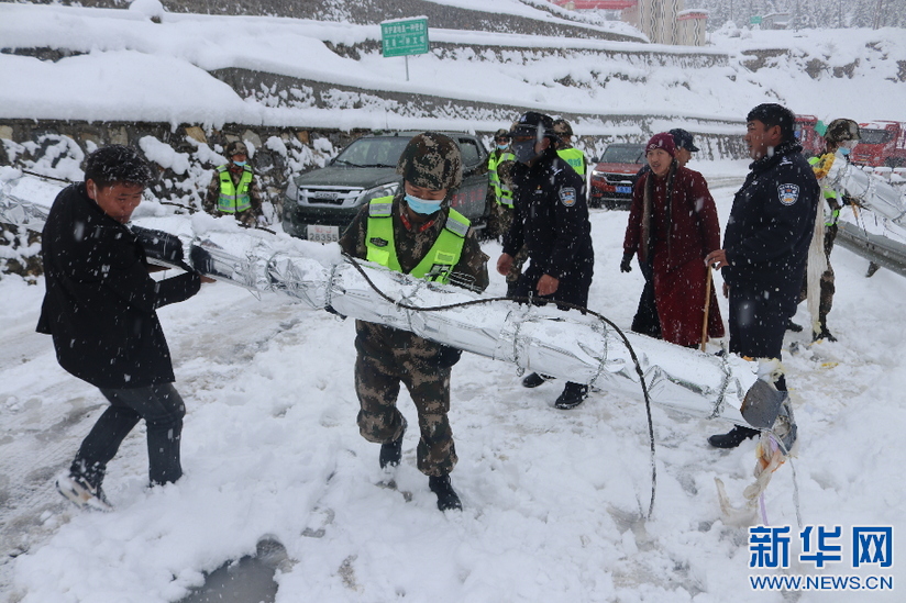 武警第二機動總隊某支隊官兵正在清理雪崩積雪(4月4日攝)。新華社發(何欽攝)
