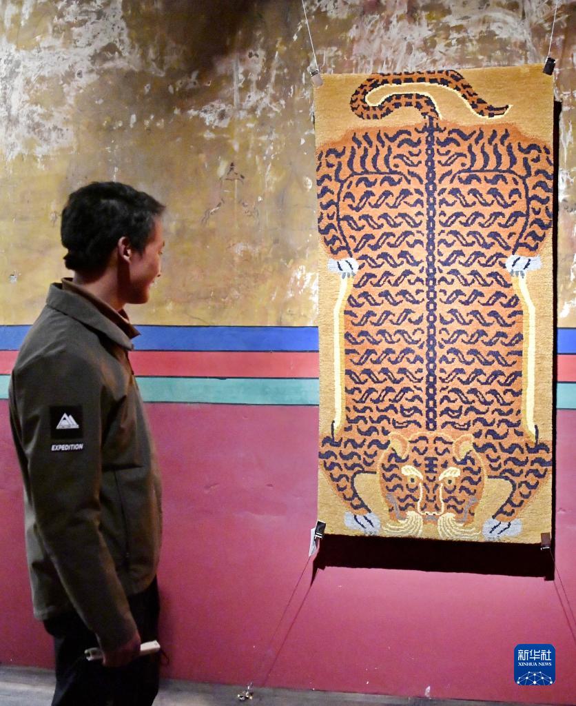 當(dāng)日,名為“智慧和無畏”的“虎毯”展覽在拉薩吉本崗藝術(shù)中心展出。西藏的非遺工作者根據(jù)古代藏毯藏品重新挖掘,整理了以“虎”為主題的圖案,設(shè)計(jì)制作了本次展覽作品。本次展覽展出20余件各具特色的藏毯藝術(shù)作品,展覽將持續(xù)到5月初。