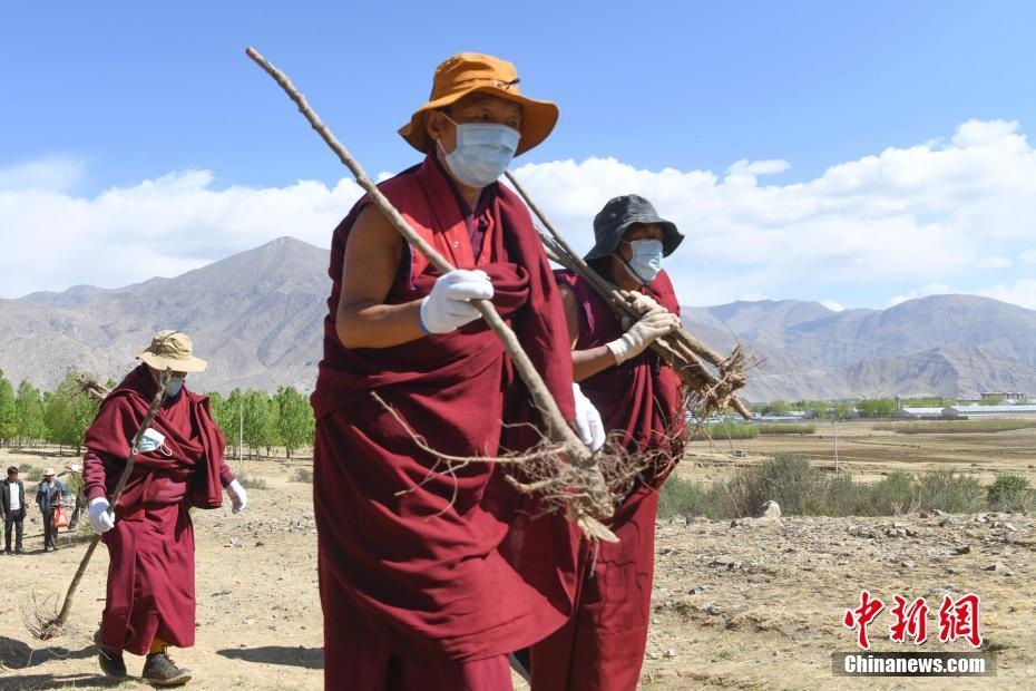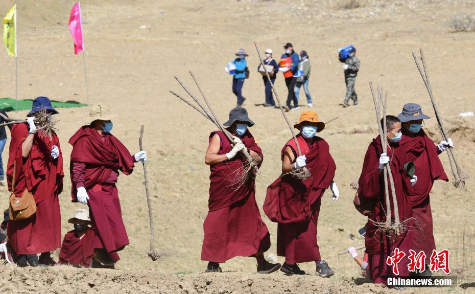 4月15日,西藏大昭寺僧人在蔡公堂鄉(xiāng)植樹。當日,西藏大昭寺在拉薩市城關區(qū)蔡公堂鄉(xiāng)啟動拉薩南北山2800余畝山地綠化工程項目。 中新社記者 貢嘎來松 攝