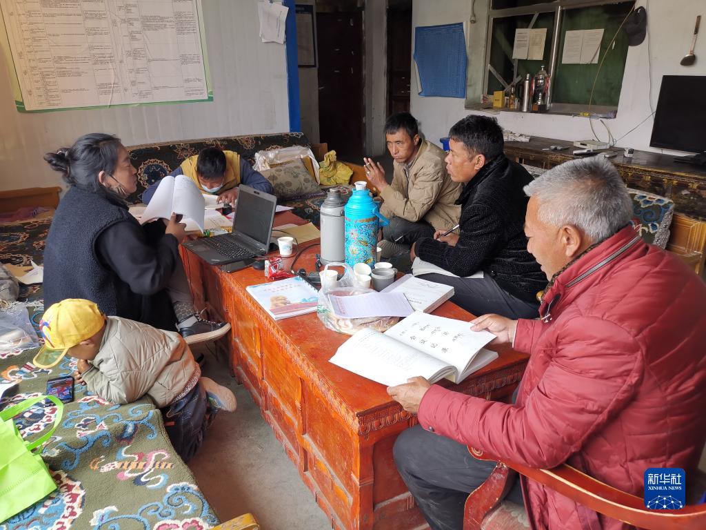 在特布拉村,駐村第一書記吉宗(女,左一)正與其他村干部開(kāi)會(huì),商討農(nóng)村廁所改造事宜。新華社記者 林建楊 攝(手機(jī)照片,4月16日攝)