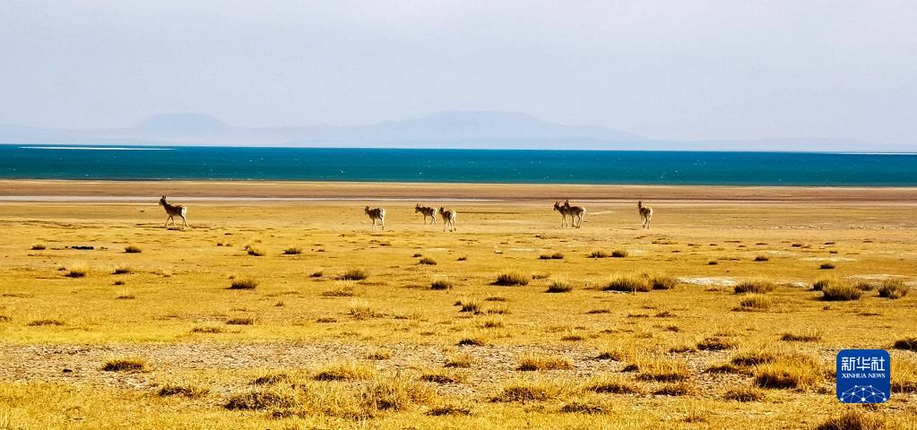 一群藏原羚在位于西藏自治區那曲市的色林錯湖邊徜徉(2022年4月13日攝,手機照片)。新華社記者 沈虹冰 攝