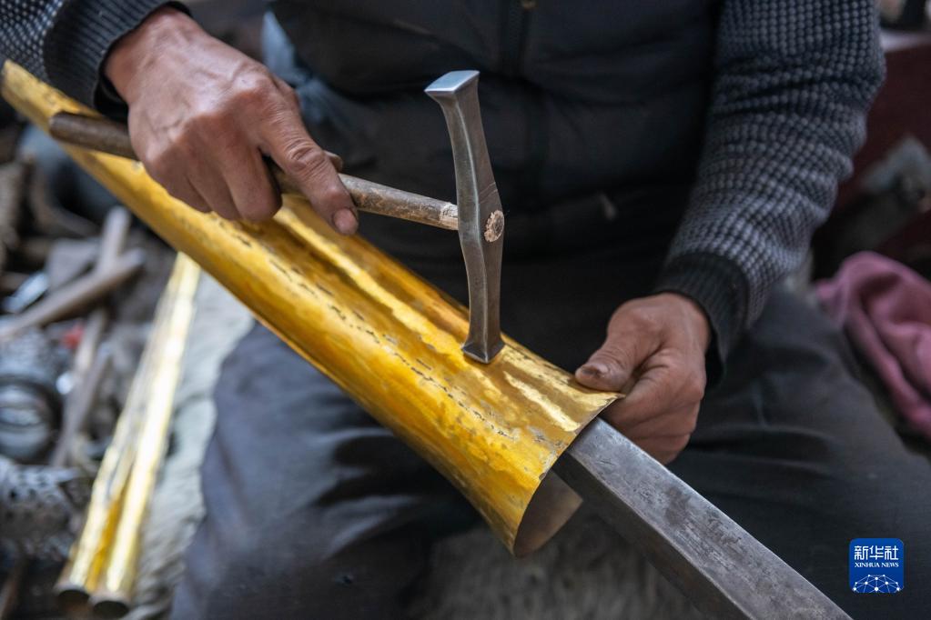 在昌都市察雅縣的產業車間,手工藝人吹響已加工好的樂器(4月8日攝)。新華社記者 周荻瀟 攝