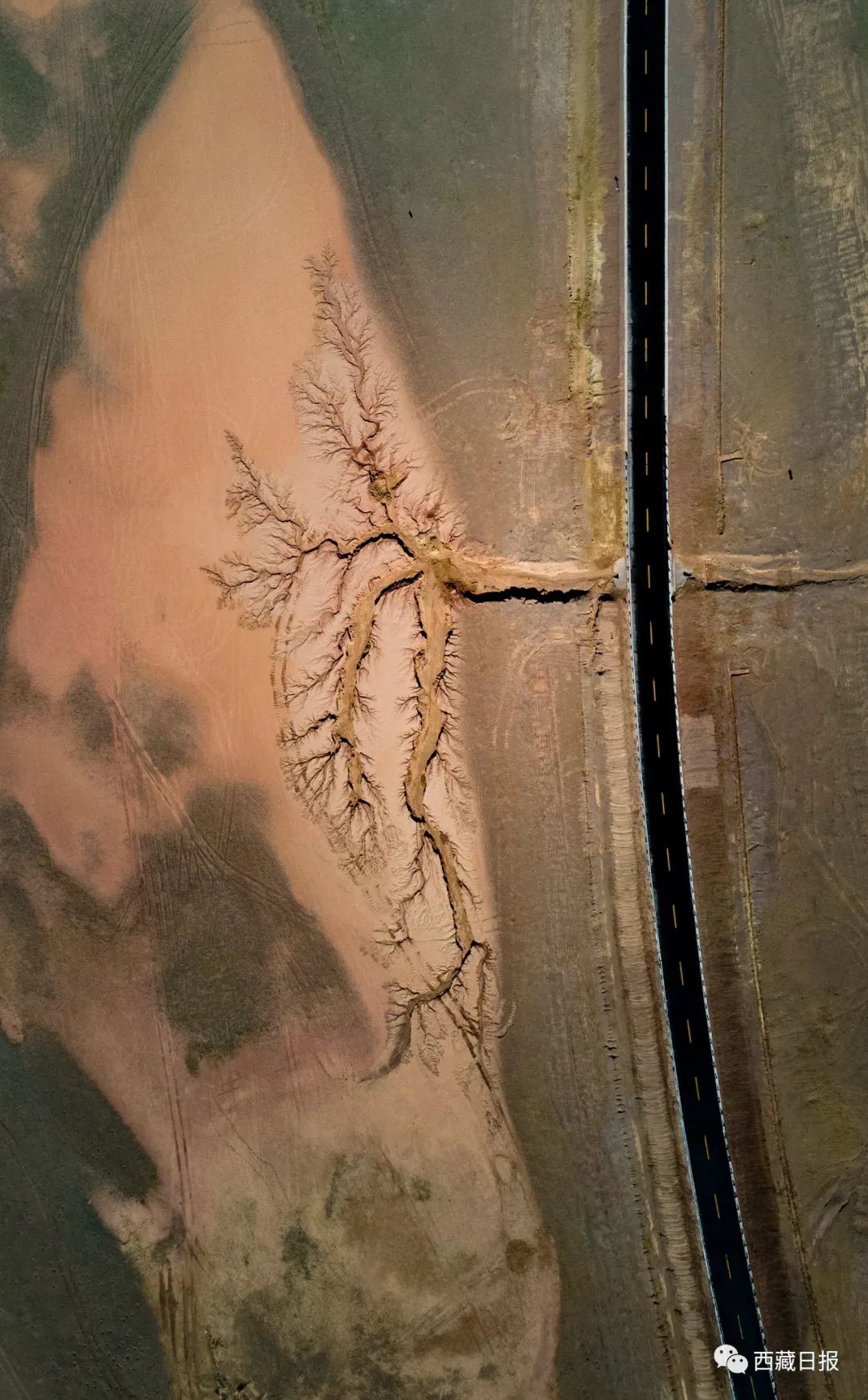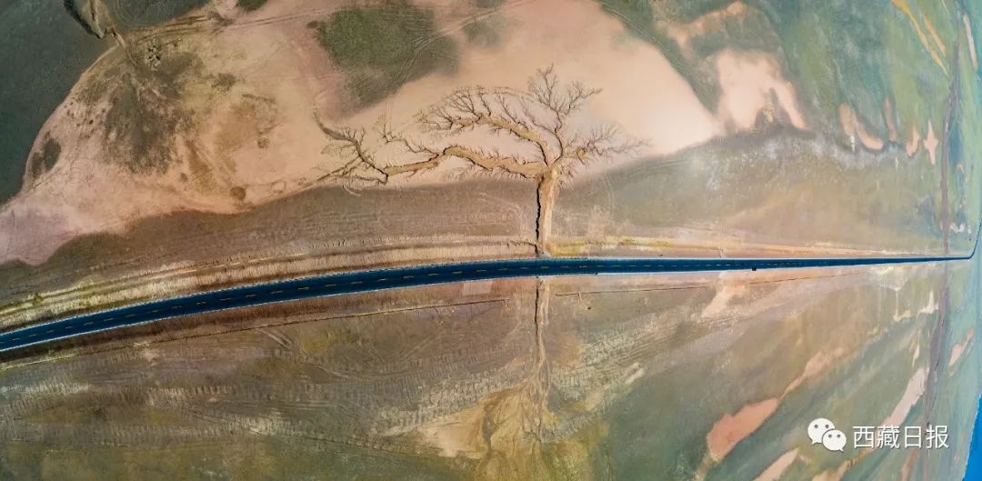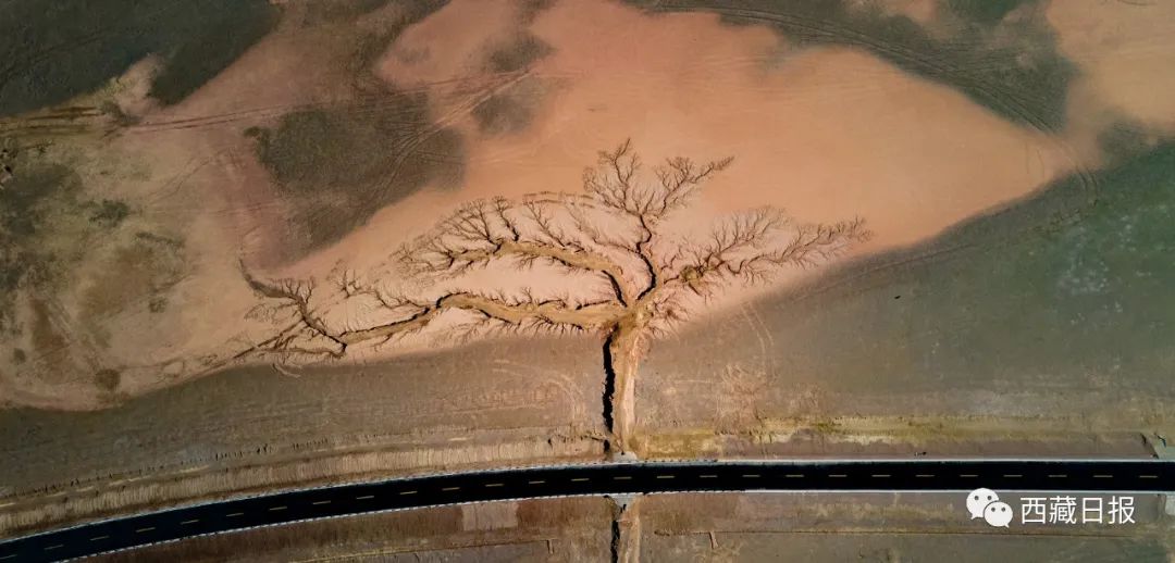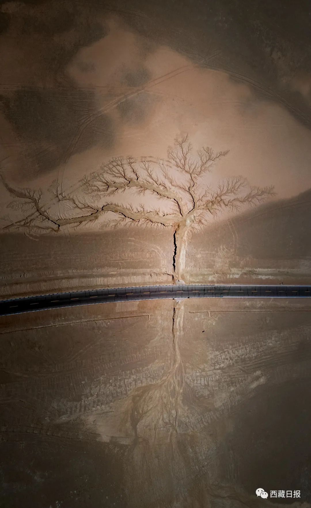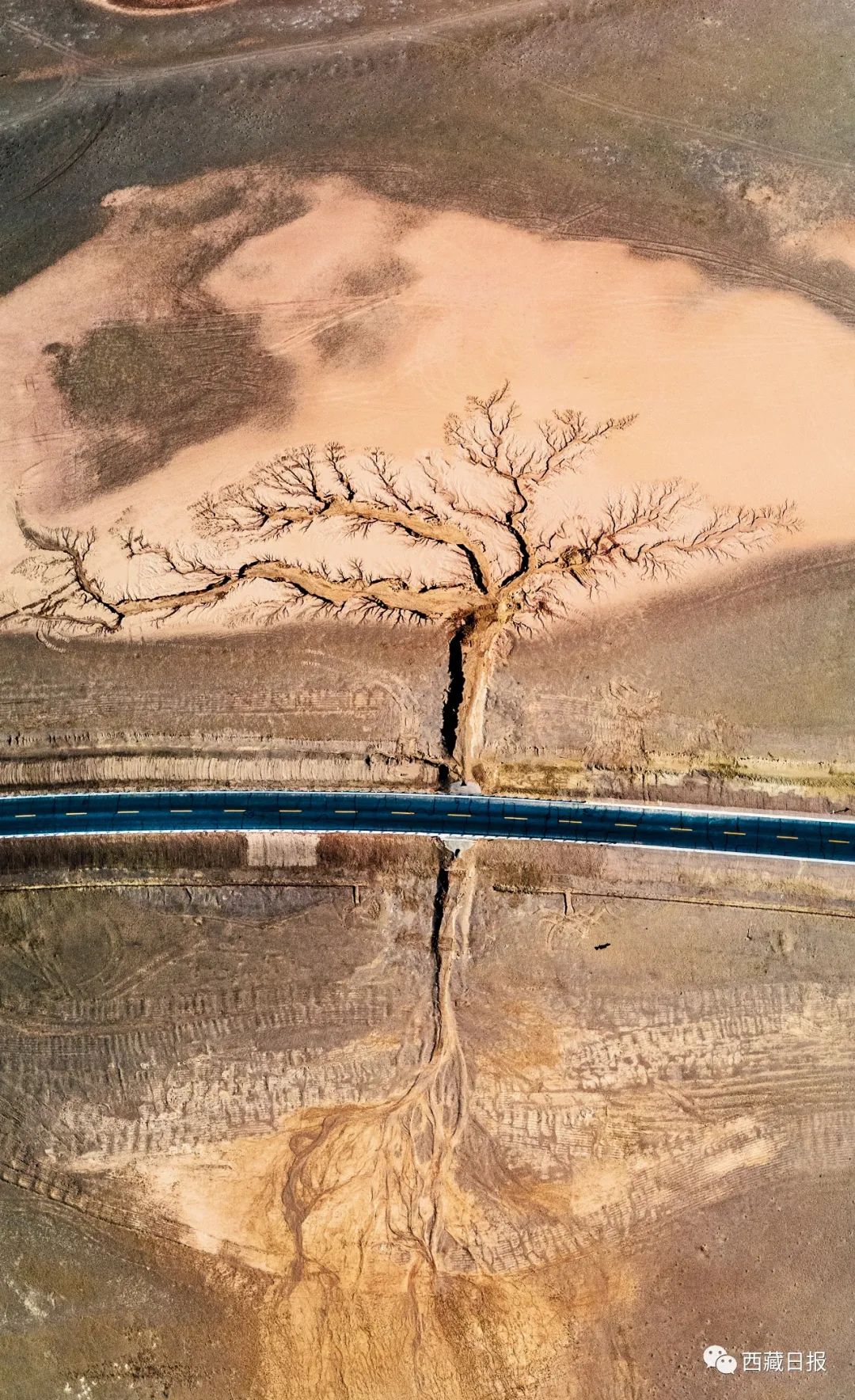 位置:“大地之樹”位于達則措南,距離尼瑪縣城30公里處,國道317 (2442)里程石墩旁邊。這棵大地之樹的樹干在國道南側,樹根在國道北側。
