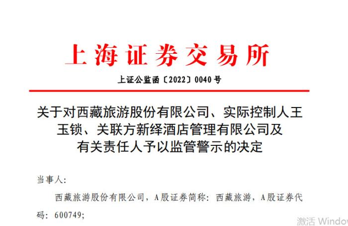 據上交所7日消息,因涉及非經營性資金占用,且相關信息披露不真實、不準確等,上交所決定對西藏旅游股份有限公司、實際控制人王玉鎖、關聯方新繹酒店管理有限公司及有關責任人予以監管警示。