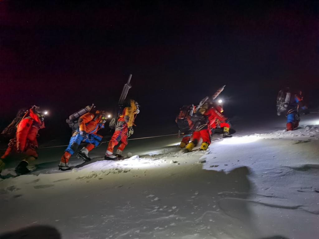 2022年5月4日凌晨,珠峰科考隊員從突擊營地出發,向珠穆朗瑪峰峰頂發起沖刺。新華社特約記者 索朗多吉 攝