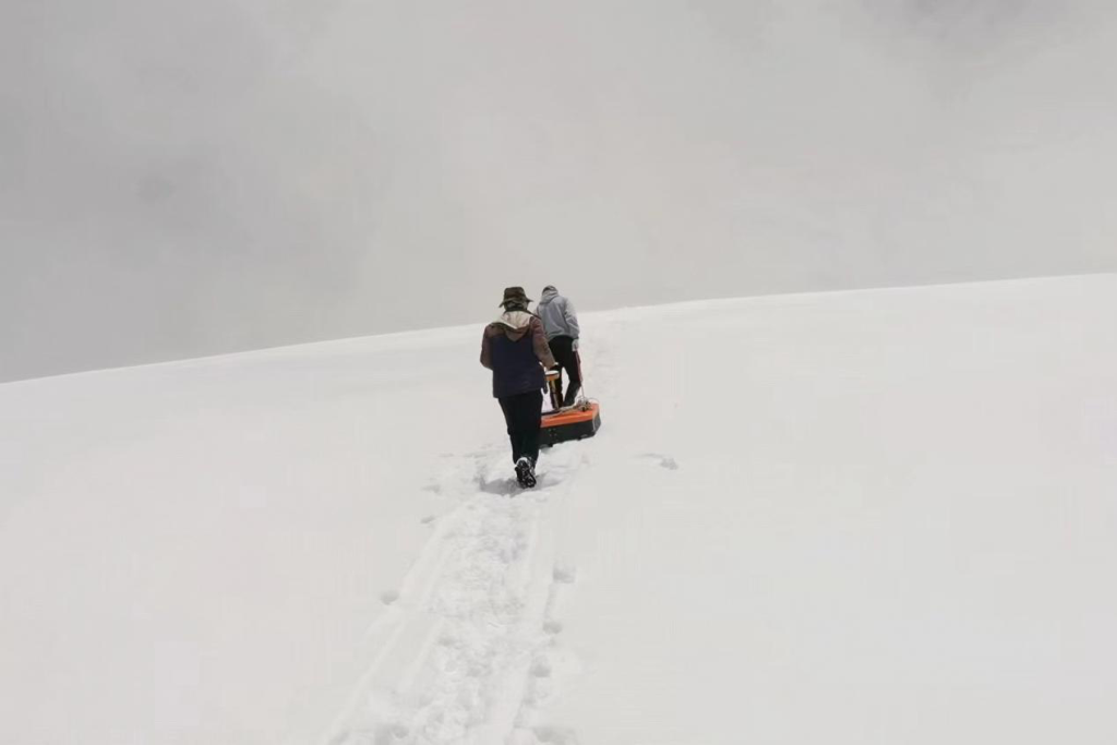 科考隊員拉著冰川雷達測厚儀開展測量工作。新華社發(fā)