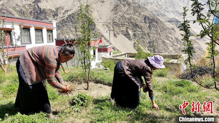圖為大姐次仁吉拉和二姐央珍在果園內勞作。貢桑拉姆 攝