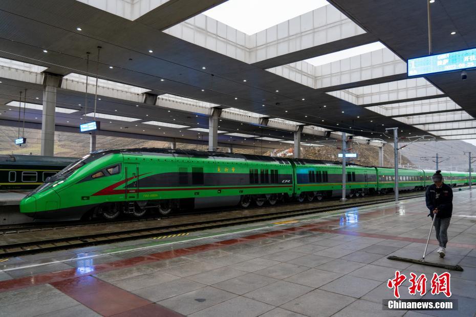 6月25日,西藏第一條電氣化鐵路——拉林鐵路開通運(yùn)營滿一周年。一年來,累計(jì)運(yùn)送旅客113.7萬人次、貨物4.78萬噸。圖為當(dāng)日,拉薩火車站內(nèi),復(fù)興號整裝待發(fā)。 中新社記者 江飛波 攝