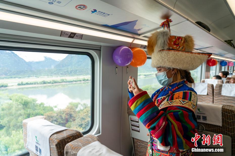 圖為當(dāng)日,西藏拉林鐵路通車一周年活動上,那曲安多牧民德吉次仁身著傳統(tǒng)盛裝首次體驗(yàn)高原復(fù)興號,在進(jìn)入林芝后記錄“雪域江南”風(fēng)光。 中新社記者 江飛波 攝