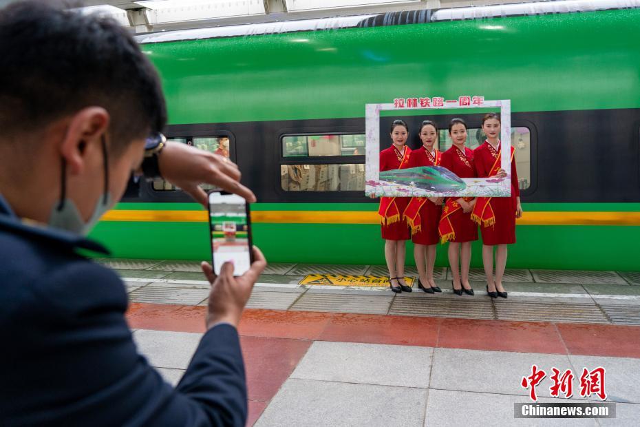 圖為當(dāng)日清晨,拉薩火車站,C881次列車出發(fā)前,“動姐”們在高原復(fù)興號前合影留念,紀(jì)念拉林鐵路通車一周年。 中新社記者 江飛波 攝