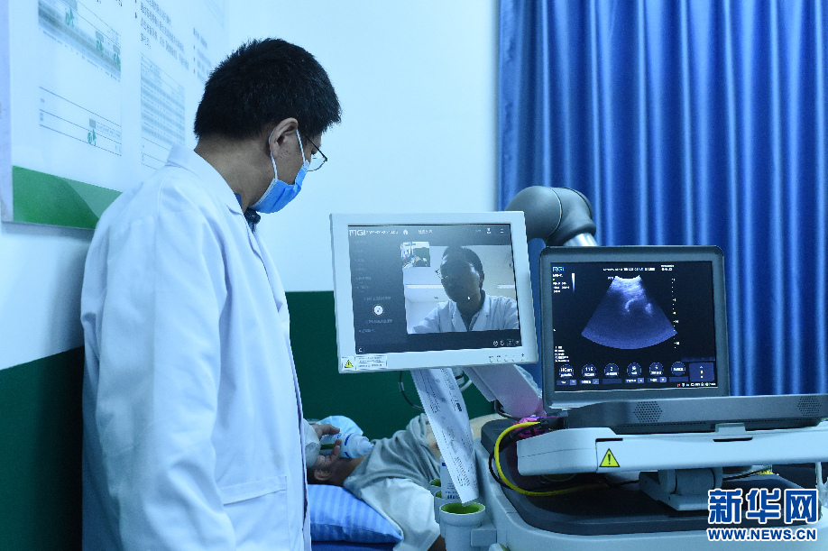圖為醫生通過5G遠程超聲診斷的形式進行會診(6月20日攝)。新華網旦增努布 攝
