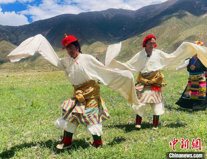圖為林周縣唐古鄉牧民在草地上跳起熱振曲卓。冉文娟 攝