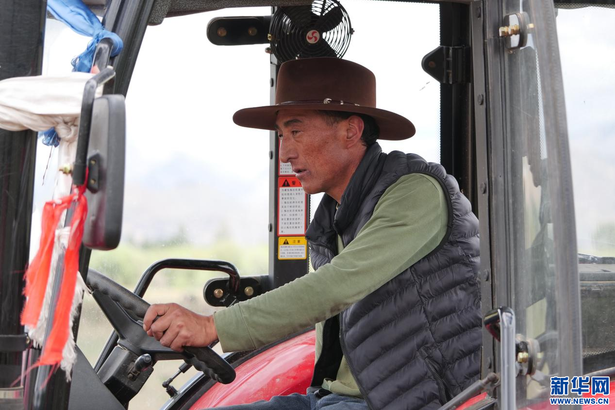 6月21日,在林周縣強嘎鄉(xiāng)曲嘎強村,農(nóng)民駕駛農(nóng)機進行播種。新華網(wǎng) 旦增努布 攝
