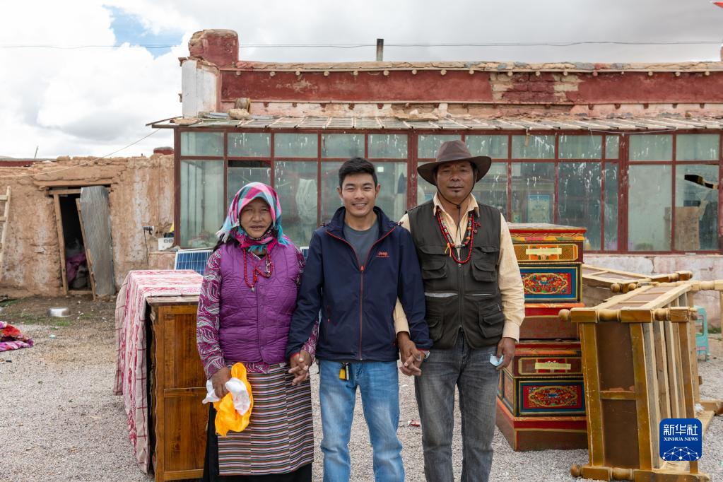 雙湖縣多瑪鄉果根擦曲村牧民貢覺多吉(中)和父母在老房子前合影。他們搬運的家具不多,準備在新家添置新家具(7月12日攝)。新華社記者 周荻瀟 攝