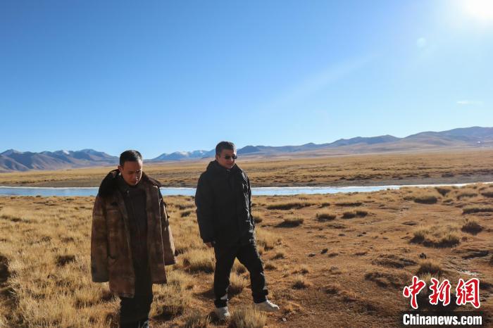 王軍強(右)在申扎縣巴扎鄉查藏藏布巡河。申扎縣委宣傳部 供圖