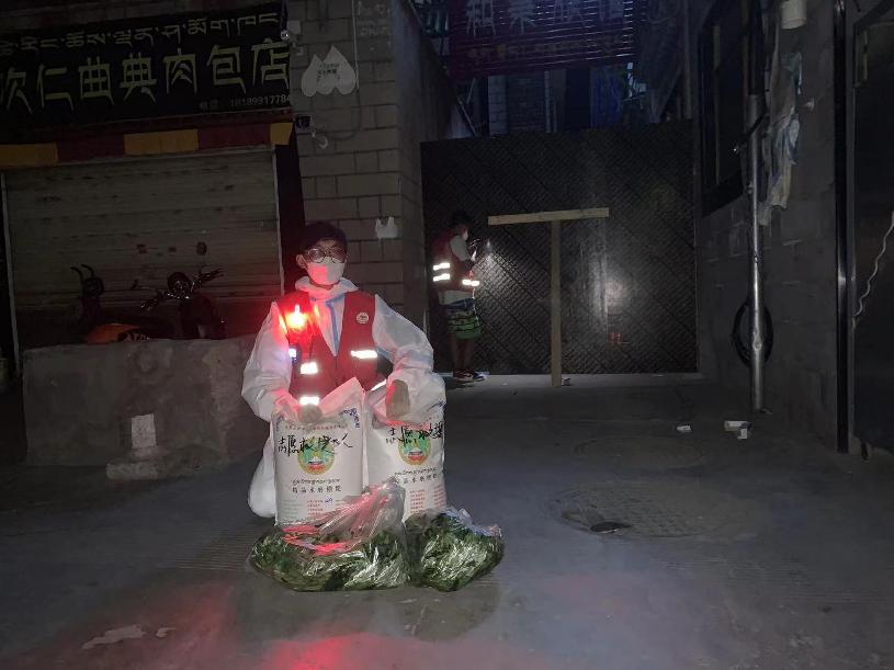 8月22日,正在嘎瑪貢桑志愿服務(wù)的救援隊隊員李正煒聯(lián)系社區(qū)工作人員,核實情況,了解這個家庭的需求后,副隊長朱奕霖采購物資,晚上隊長陳雷將嘉措居委會、八一社區(qū)、第十一安居苑等社區(qū)的捐贈防疫物資配送完畢后,回到東郊,將糌粑、蔬菜等食品送往嘎瑪貢桑高風險區(qū),交到了救助家庭人員的手中。