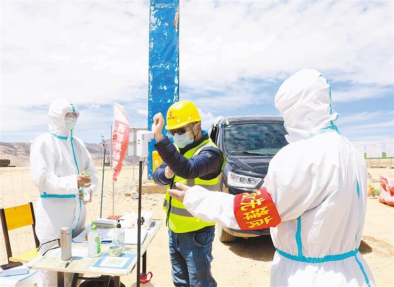 在西藏阿里普蘭機場項目施工現場,施工人員經過體溫檢測、身份登記、消毒等程序后,才能進入工地。施工現場機器轟鳴,管理人員分兵把口,施工人員各司其職,整個工地處處都是忙碌的身影。