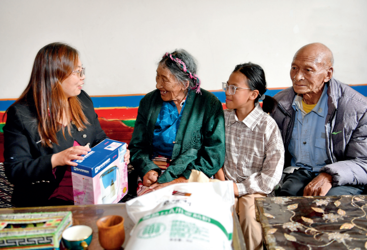 王玉秀(左一)來到拉薩市達孜區德慶鎮次旦老人家走訪并送上慰問品(2022 年 7 月 27 日攝) 張汝鋒攝