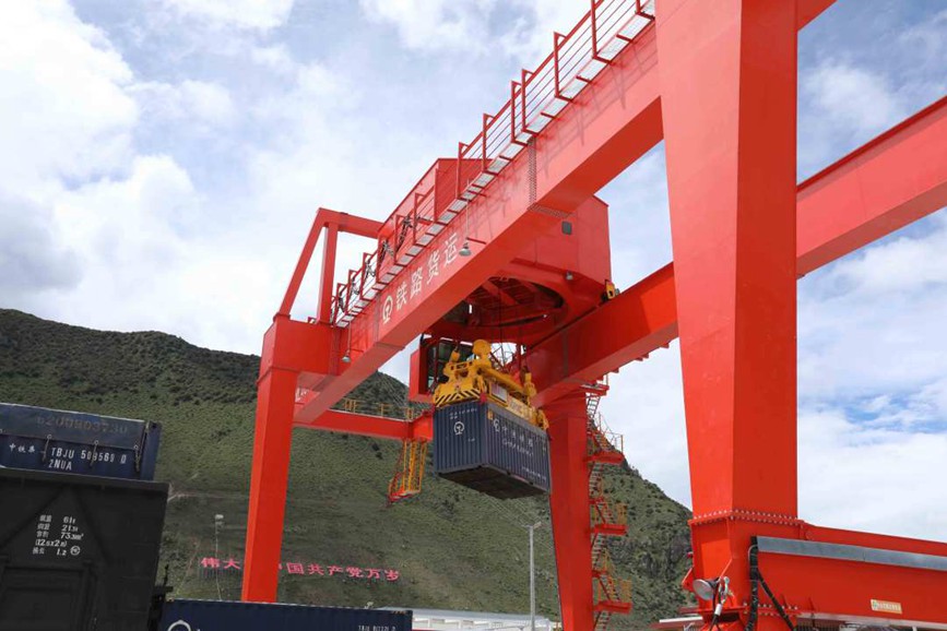 林芝站貨場內,集裝箱門吊不停的作業,一車車貨物不停的裝運,一個個忙碌的身影也清晰可見,他們用堅守換來拉林鐵路貨物的安全運輸,也為林芝市物資保障貢獻了一份力量。