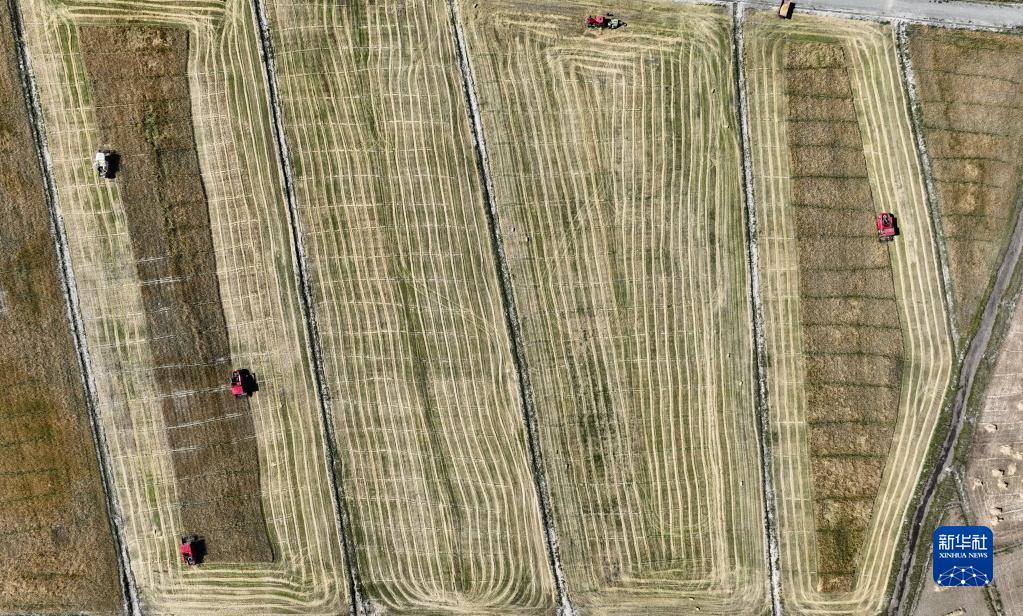西藏日喀則市江孜縣熱索鄉努康村農機合作社的村民集中對村里三千多畝耕地進行機械化收割(9月19日攝,無人機照片)。新華社記者 晉美多吉 攝