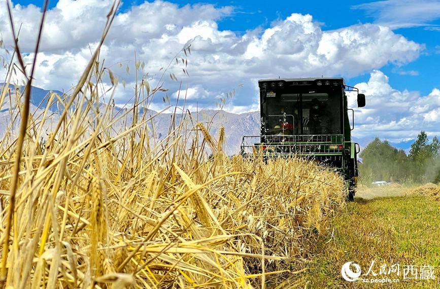 農戶使用收割機收青稞。次仁羅布 攝