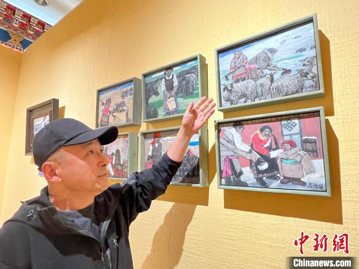 策展人李亞男向中新網記者介紹,崔曉曉首次到西藏那曲便結識了一位當地朋友——拉果,他將這位藏族青年放牧、添置汽車、蓋新房等畫面用畫筆記錄了下來,在本次展覽中展出。