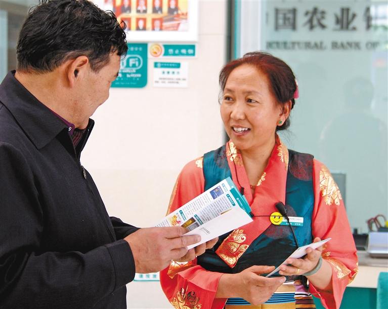 圖為農行山南分行員工向客戶宣傳普及金融知識。
