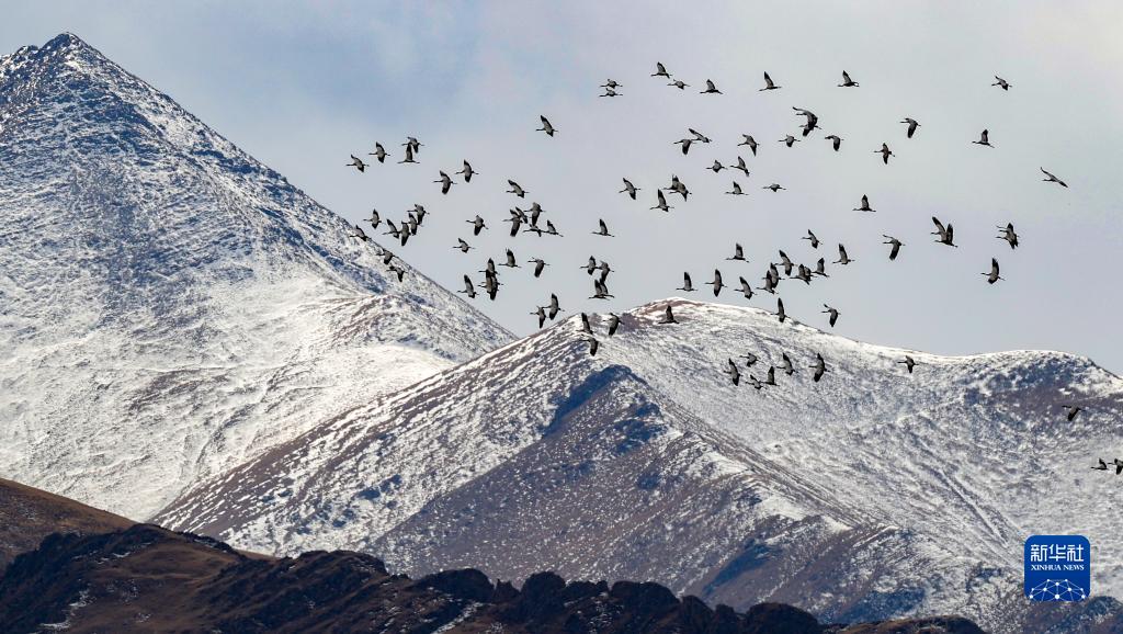 黑頸鶴群飛過(guò)林周縣強(qiáng)嘎鄉(xiāng)境內(nèi)山梁(11月6日攝)。新華社記者 姜帆 攝