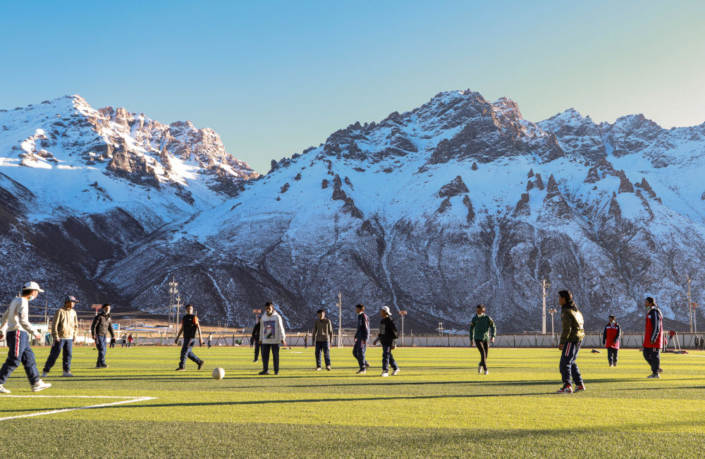 西藏那曲市嘉黎縣中學的學生們在踢足球(11月23日攝)。新華社發(索朗 攝)