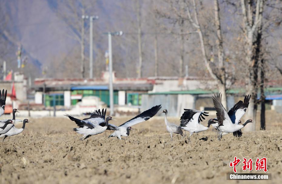 每年的10月底,成群的黑頸鶴飛到西藏拉薩市林周縣越冬,在拉薩市林周縣周邊的湖泊濕地度過5個月的“閑云野鶴”生活,次年三四月份再飛向藏北草原繁殖。黑頸鶴是世界上唯一一種高原鶴類。具有足長、喙長、頸長的典型涉禽類特征,適合在沼澤地里行走。黑頸鶴的頸、尾為黑色,體羽為灰白色。黑頸鶴是國家一級保護動物。目前,每年到林周縣越冬的黑頸鶴已達2000只左右。圖為黑頸鶴在林周境內的農田里飛翔。 貢嘎來松 攝