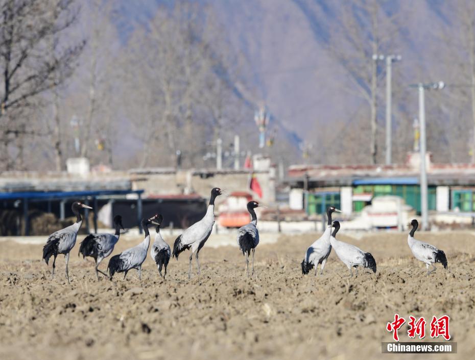 每年的10月底,成群的黑頸鶴飛到西藏拉薩市林周縣越冬,在拉薩市林周縣周邊的湖泊濕地度過5個月的“閑云野鶴”生活,次年三四月份再飛向藏北草原繁殖。黑頸鶴是世界上唯一一種高原鶴類。具有足長、喙長、頸長的典型涉禽類特征,適合在沼澤地里行走。黑頸鶴的頸、尾為黑色,體羽為灰白色。黑頸鶴是國家一級保護動物。目前,每年到林周縣越冬的黑頸鶴已達2000只左右。圖為黑頸鶴在林周境內的農田里覓食。 貢嘎來松 攝