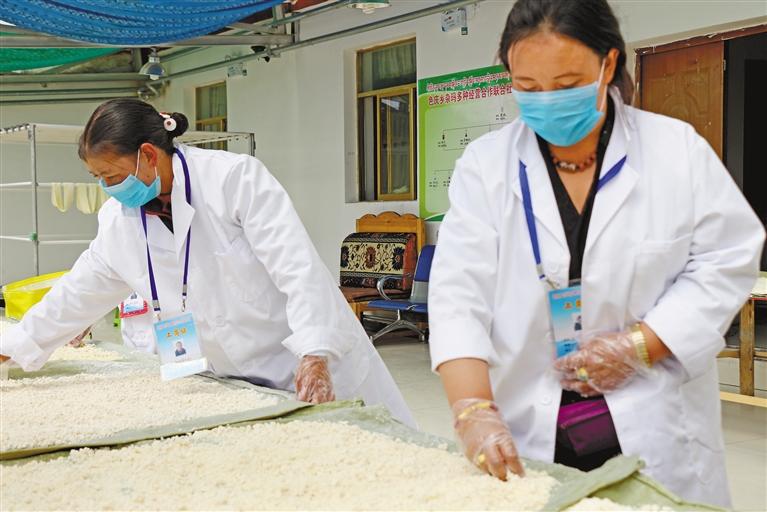 圖為聶榮縣色慶鄉雜瑪多種經營合作社工作人員對奶渣進行干燥處理。 記者 萬靖 謝偉 攝