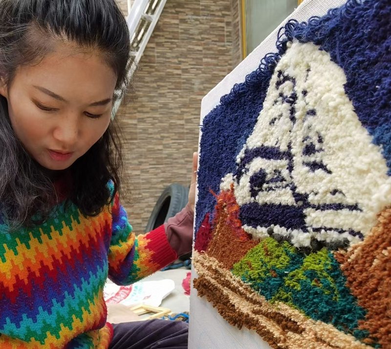 不過,起初也遇到了不少困難和挑戰(zhàn)?!鞍⒓褌儯ú卣Z:對年長女性的尊稱)的編織手藝都很棒,但她們幾乎沒上過學(xué),拘泥于傳統(tǒng)思維,創(chuàng)新力不足,做出來的產(chǎn)品花樣陳舊,一直打不開市場。而且她們對很多新鮮事物的接受度低,不愿意改變。比如她們只做色彩鮮艷的氆氌(藏族人民手工生產(chǎn)的一種毛織品,可做衣服、床毯等)。我想打破慣常思維,做一些時髦的產(chǎn)品出來?!贝稳是浠貞洝?/p>