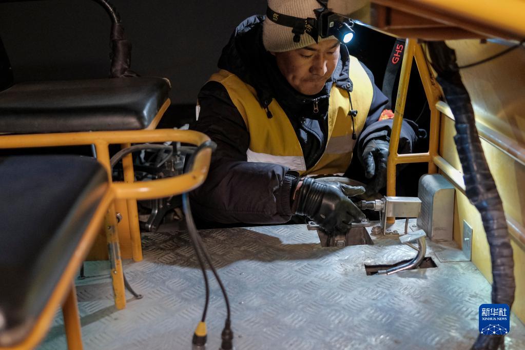 羅布和同事進行鋼軌探傷前的準(zhǔn)備工作(1月12日攝)。新華社記者 孫非 攝