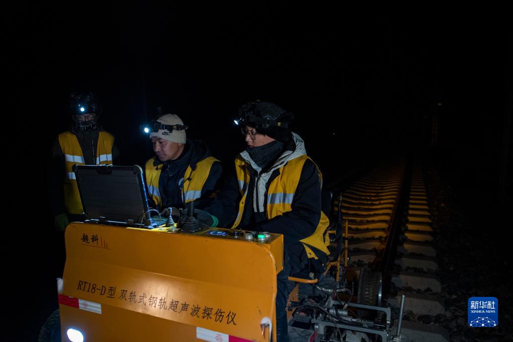 羅布(左)和同事在進行鋼軌探傷作業(yè)(1月12日攝)。新華社記者 孫非 攝