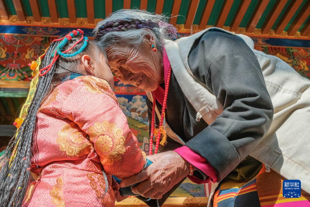 在位于西藏日喀則拉孜縣扎西宗鄉雜村的家中,次旦老人一臉幸福的微笑,家中小輩正輪流上前和她行碰頭禮。