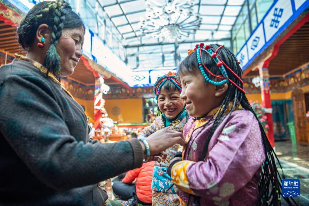 今年,日喀則藏歷農家年和春節“巧遇”同一天,雖習俗不同,但年味皆濃。次旦的兒孫早早開車去縣城采買了年貨,兒媳婦們在家準備過年吃的羊頭、切瑪等傳統特色美食。家中的第四代,次旦老人的重孫子和重孫女們,則穿上了漂亮的藏裝,頭戴綠松石點綴的頭飾,在家中歡快地跑來跑去。