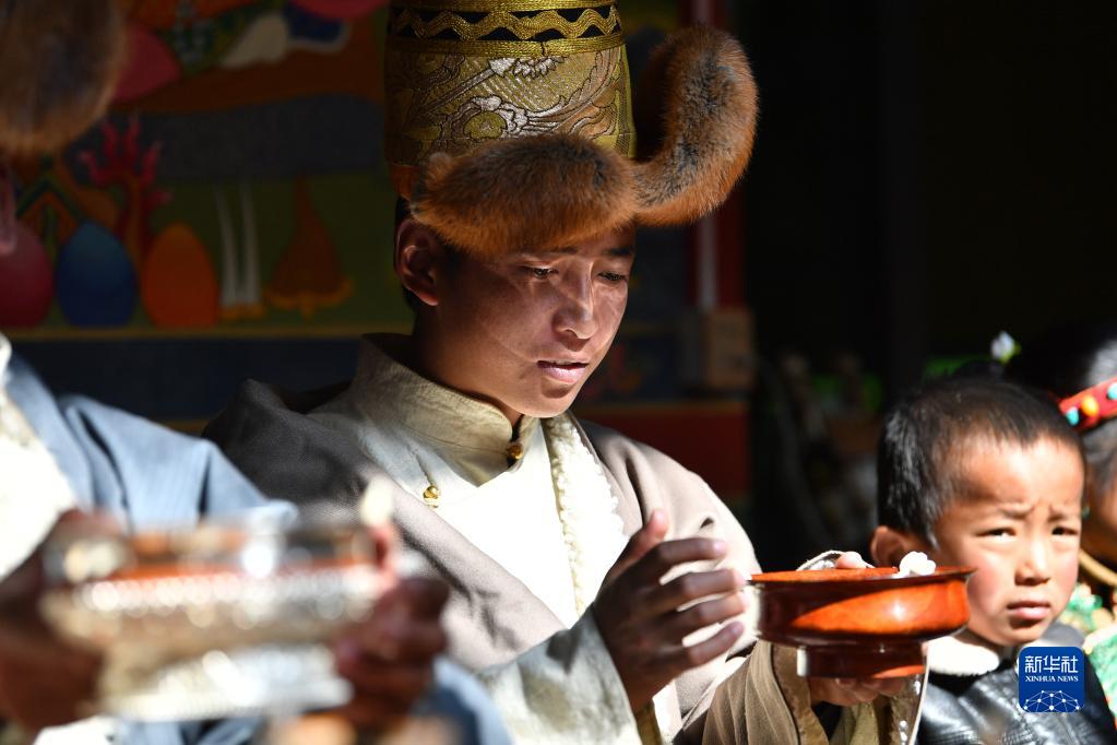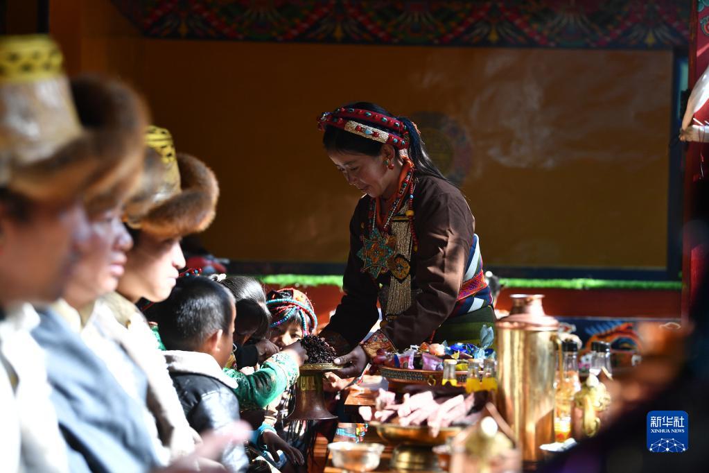 次旦老人接過孫女敬獻的切瑪(1月22日攝)。新華社記者 晉美多吉 攝
