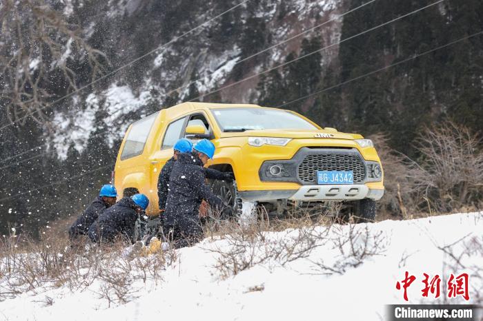 盤山公路上,積雪和暗冰使車輛打滑無法繼續前行,羅布頓珠和隊友只好下車,給車輛掛好防滑鏈繼續前行,原本兩個小時的車程,這次花了4個小時才抵達巡線點。